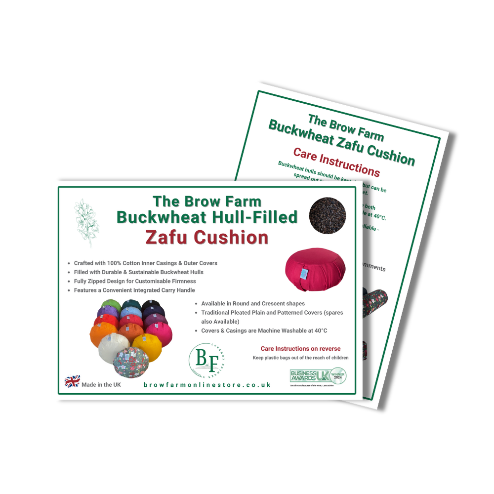 Firmly filled with sustainable buckwheat hulls. 100% cotton outer cover and inner casing, each zipped for easy care - washable at 40°C (remove hulls if washing the inner casing).