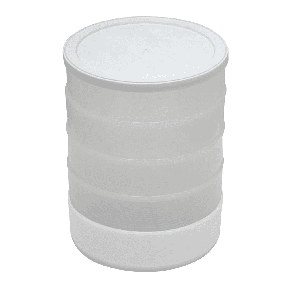 Includes four 6" perforated sprouting trays, a top reservoir, drainage base, and lid. Total height: approx. 8.25".
